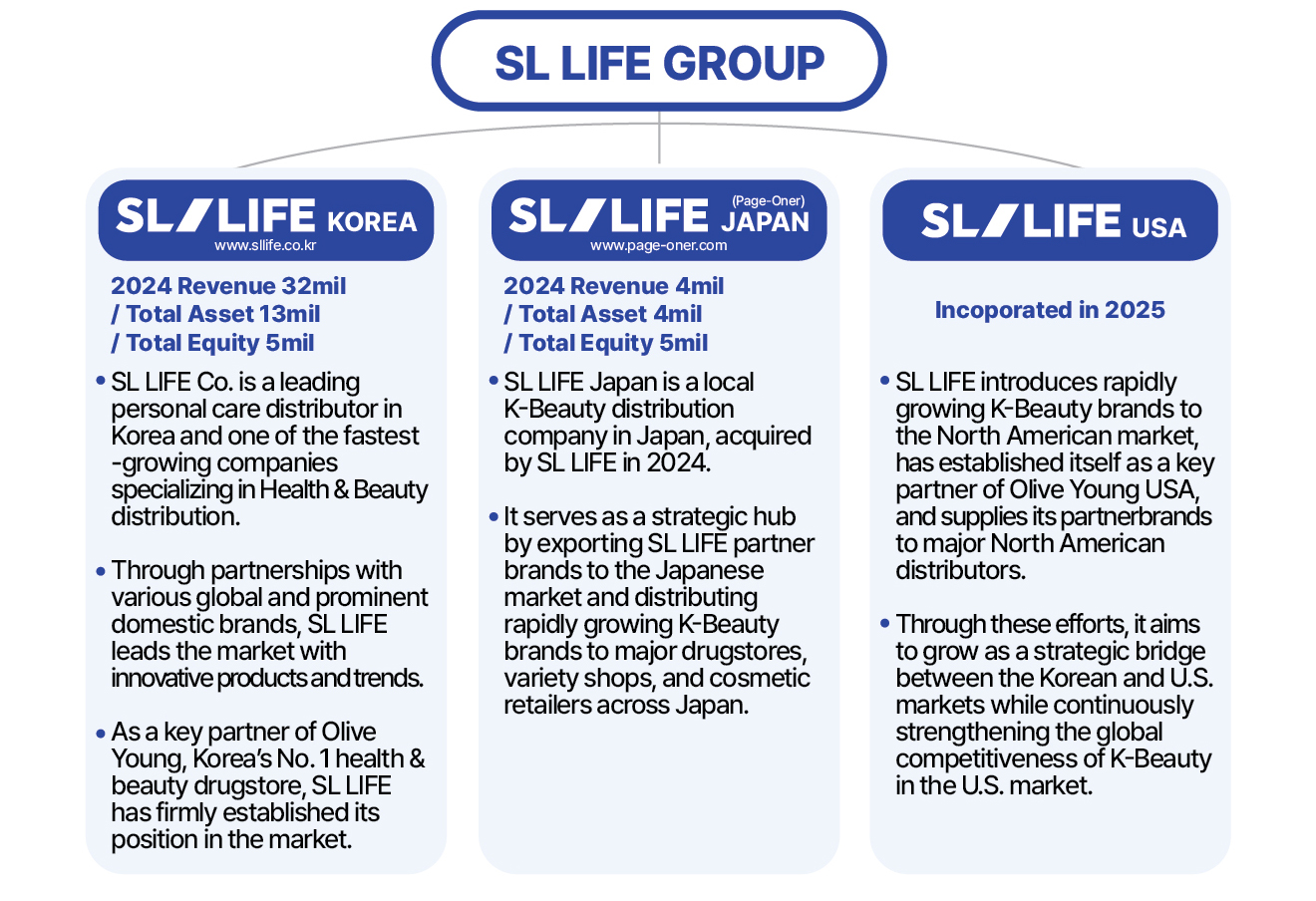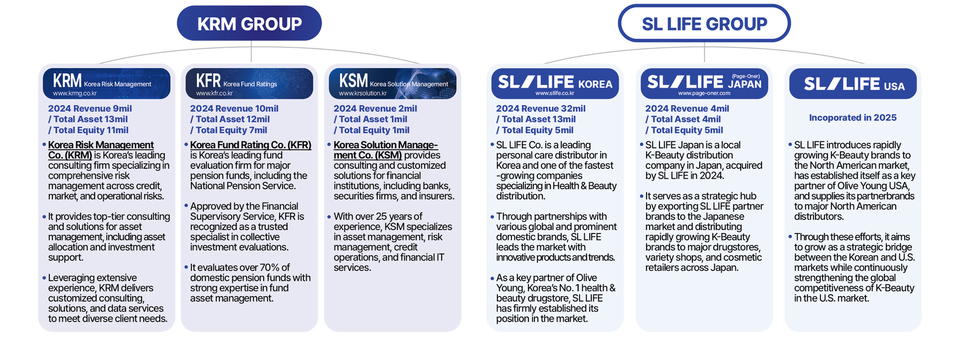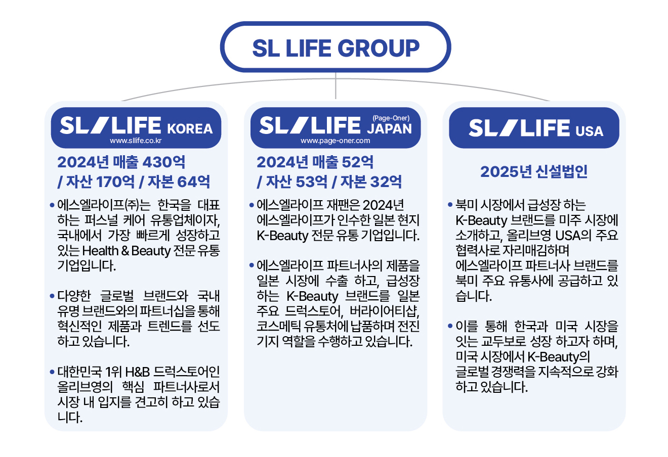 SL LIFE Affiliated Companies 2024 Total Sales: 56 billion KRW / Total Assets: 43 billion KRW / Total Shareholder's Equity: 26 billion KRW